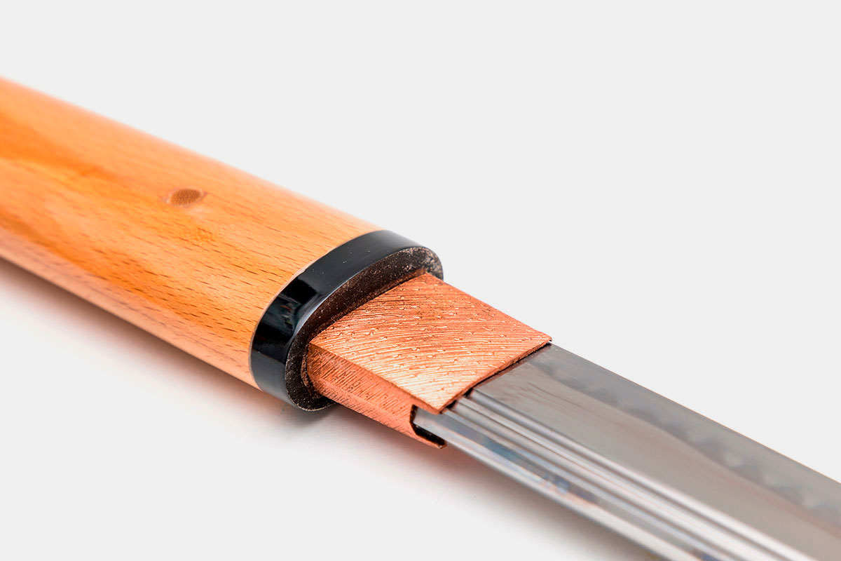 Nakago 茎: Parte de la hoja que se inserta en la tsuka, protegida contra la oxidación gracias al ajuste preciso de la madera.